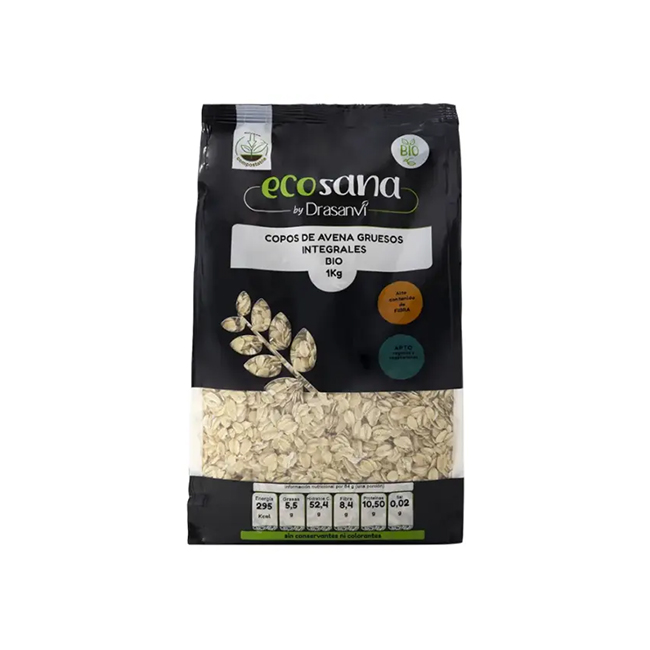 • Copos de avena integral ecológicos que aportan fibra para una dieta saludable.