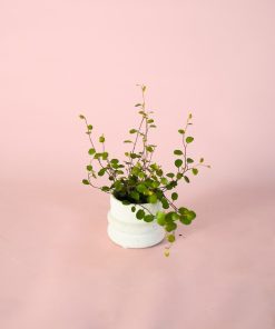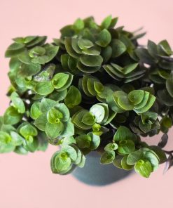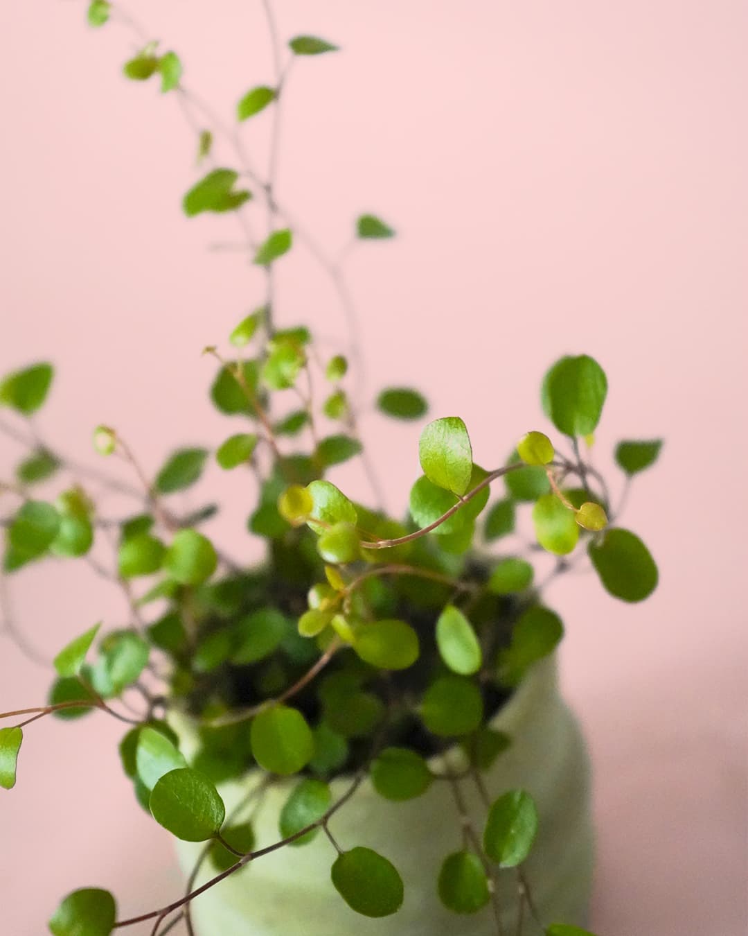 Esta planta trepadora y enredadera es todo terreno. Tiene tallos finos y flexibles que se llenan de hojitas redondas, verdes y pequeñas. Su forma ligera y alocada la hace perfecta para colgar o dejar que se desborde de una maceta.