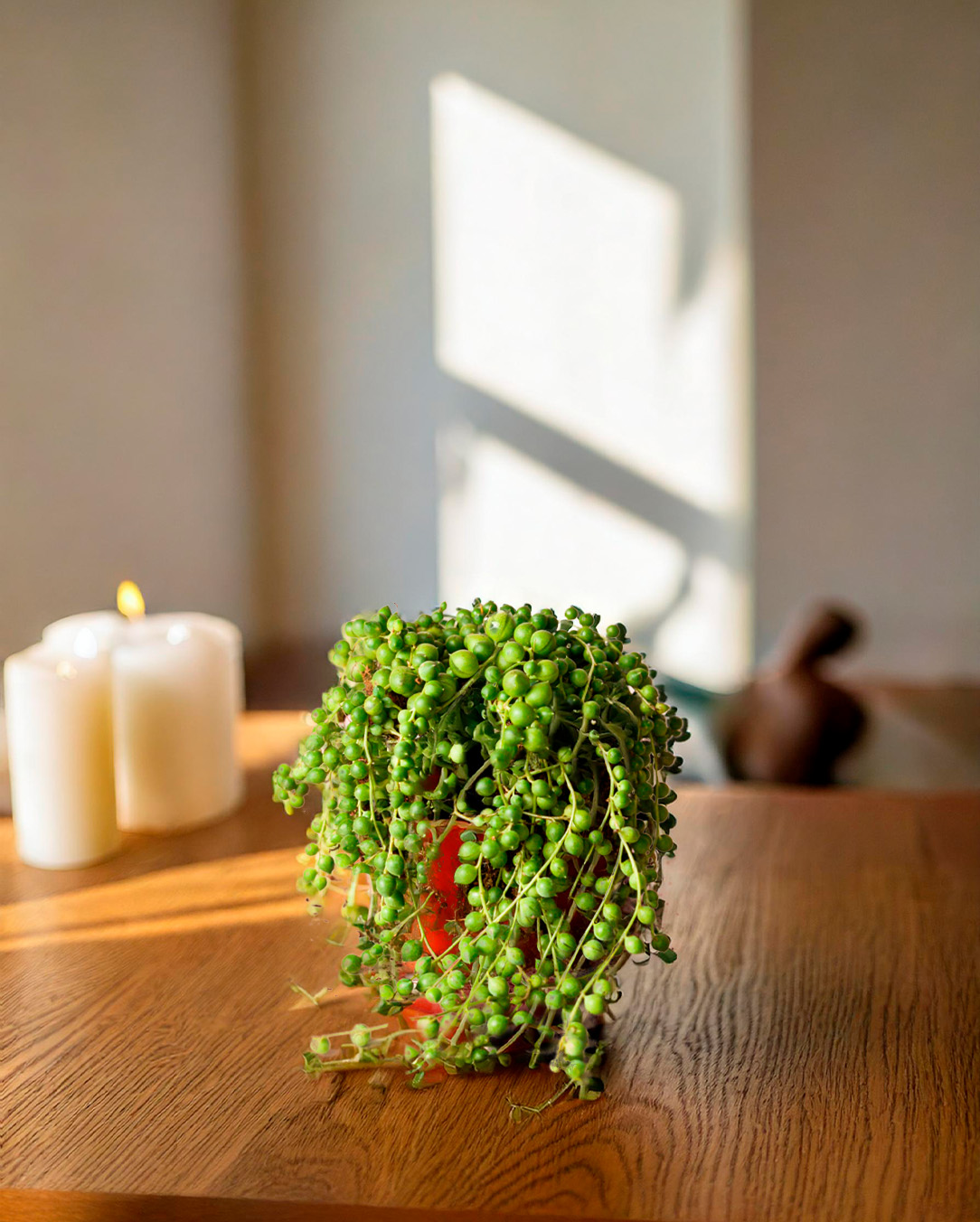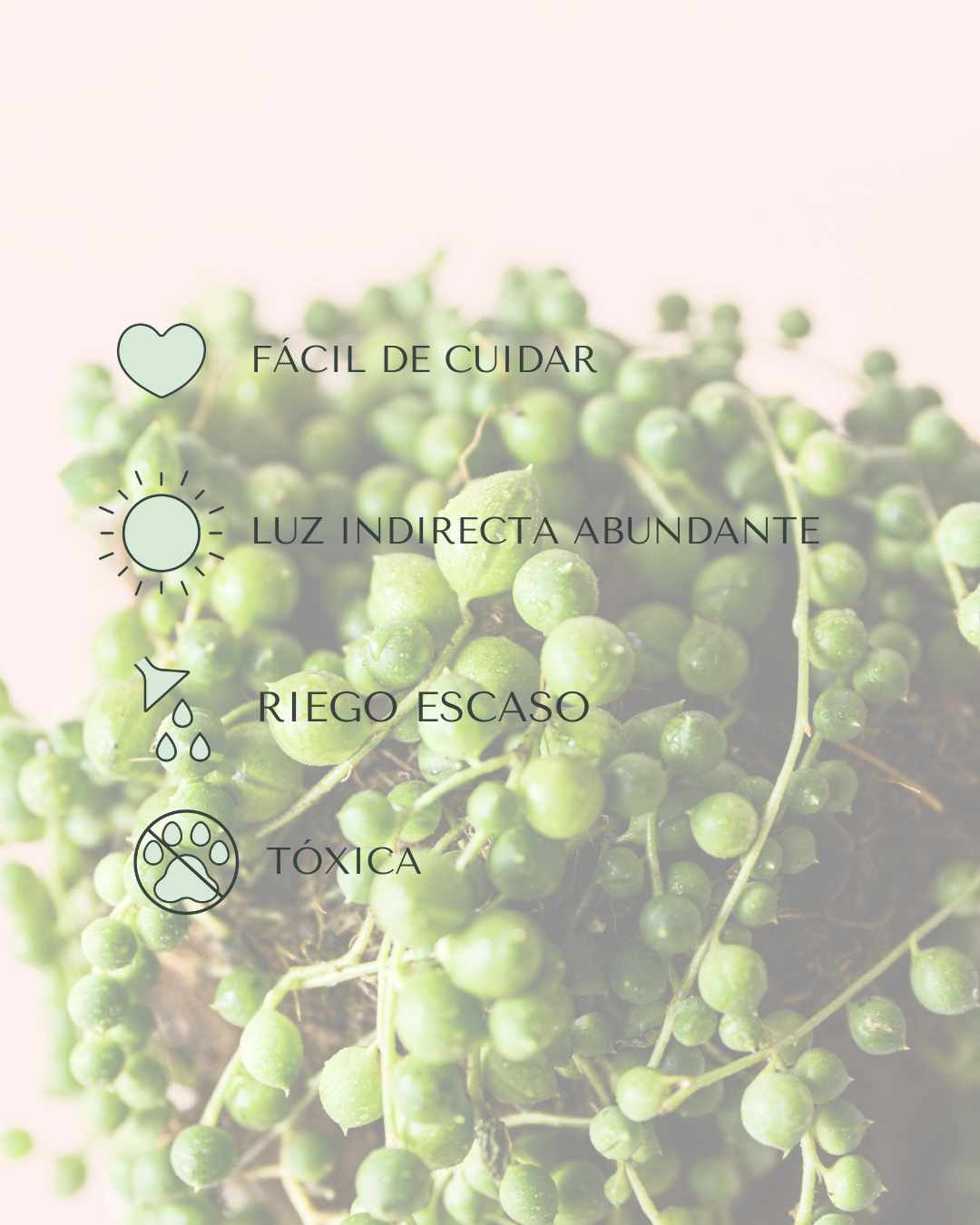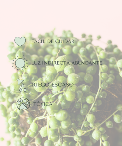 Para cuidarlo, colócalo en un lugar con luz brillante pero indirecta, y asegúrate de no regarlo en exceso, ya que es susceptible a la pudrición de raíces. Deja que el sustrato se seque ligeramente entre riegos para mantenerlo feliz y saludable. Además, dale un poco de amor y atención, ¡y te recompensará con sus largas y hermosas bolitas que dan la sensación de un collar de perlas en tu hogar!